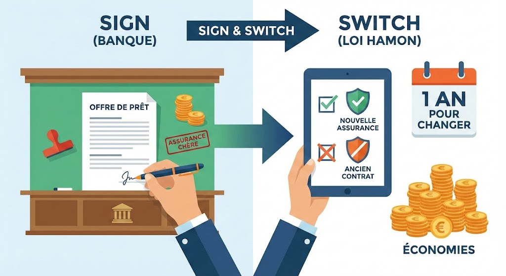 Bien que la vente liée soit interdite par la loi Murcef, cette pression existe bel et bien dans les agences. C’est une réalité économique : un dossier sans assurance est moins rentable pour la banque. Plutôt que d’entrer dans un conflit frontal risqué, voici comment utiliser la mécanique administrative à votre avantage avec la technique du “Sign & Switch”.